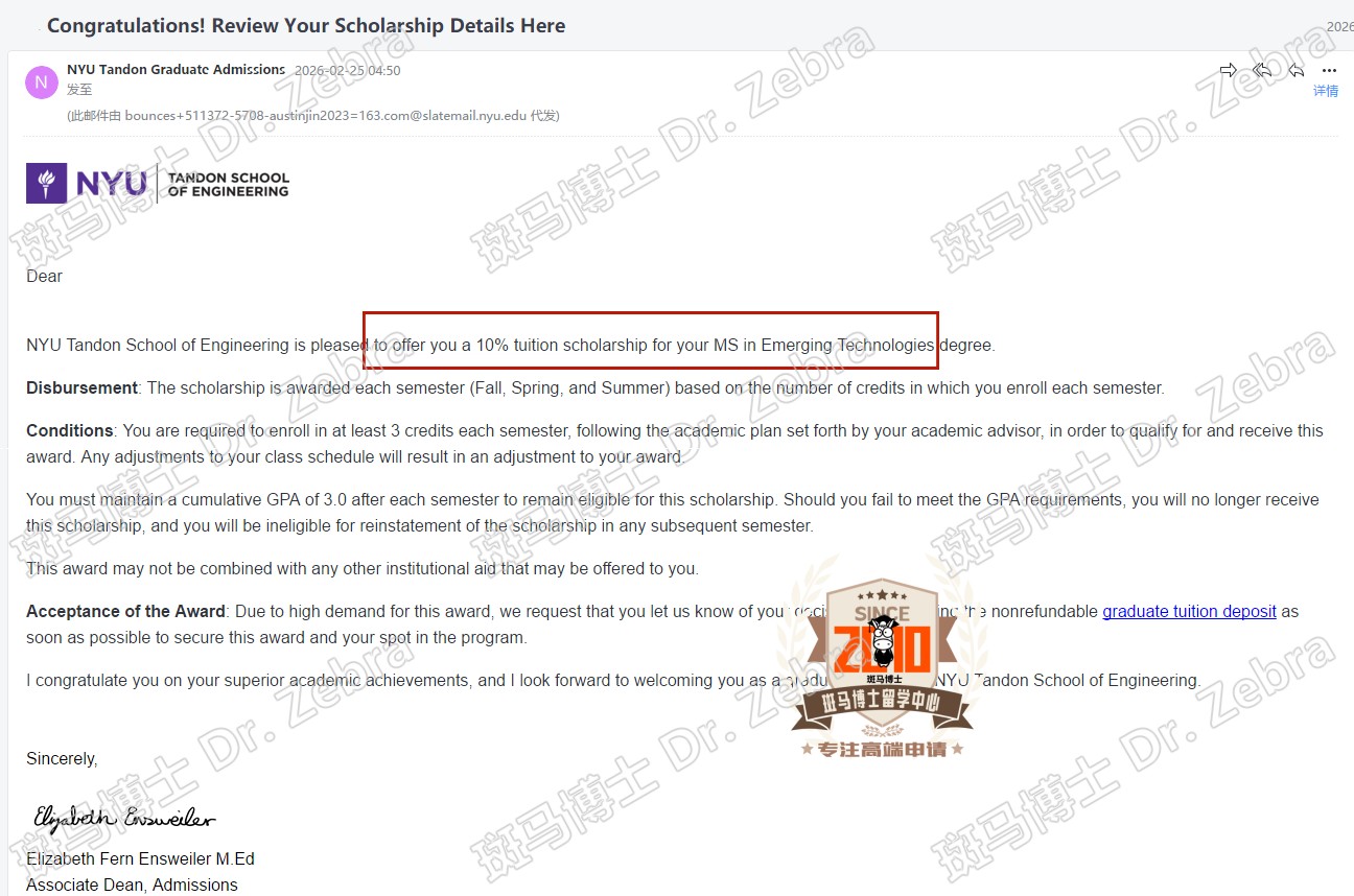 【斑马博士捷报】英本,WES GPA2.8+, 无GRE获得NYU Emerging Technologies硕士录取+10%学费减免奖学金!